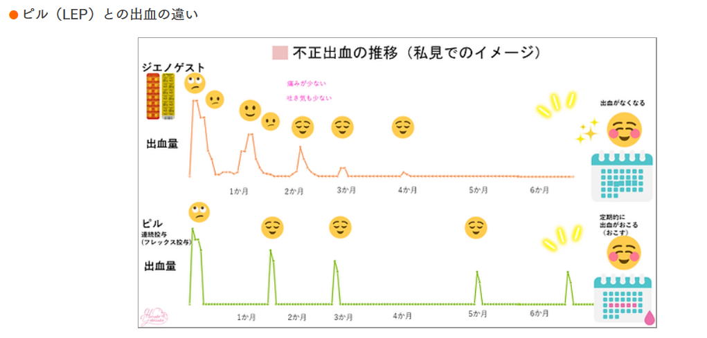 ジエノゲストはピルに比べ不正出血が起きやすいです。